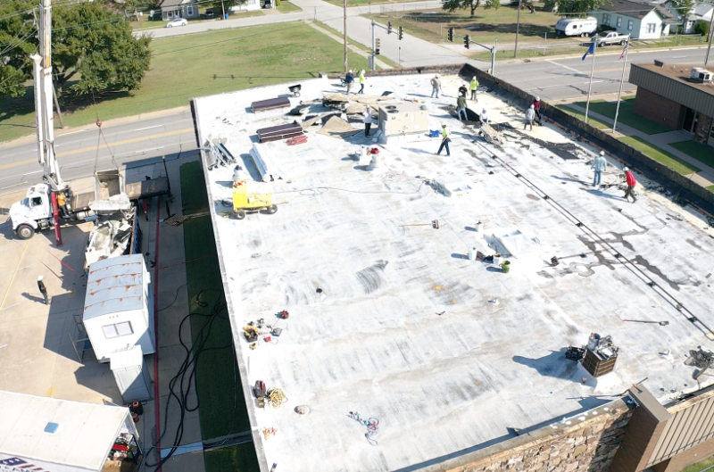 With the HVAC units gone, progress continues on the Gene Russell building. Here, workers prepare to install a new roof.